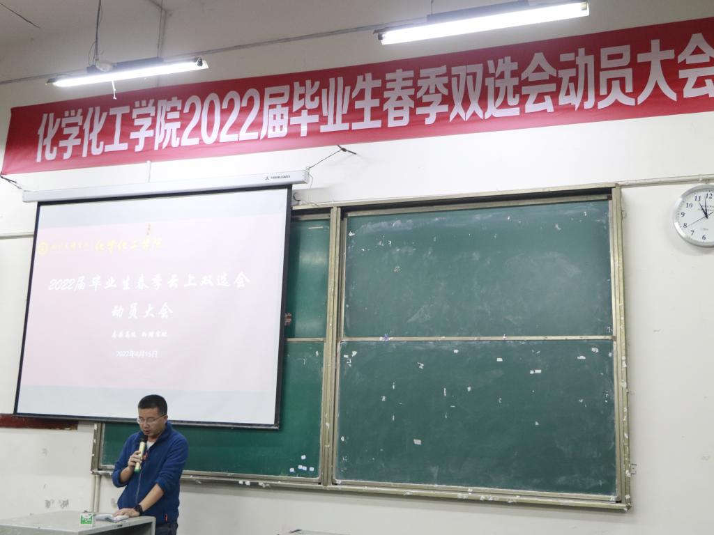 2022年4月15日上午11点,beat365官方网站于南坝校区一教楼111教室举办了2022届毕业生春季云上双选会动员大会,学院党总支书记朱朝菊、院长赖川、副院长向文军、各教研室主任、学工办全体老师和毕业班带班辅导员及2018级100余名毕业生出席会议,大会由学院党总支副书记潘维主持。