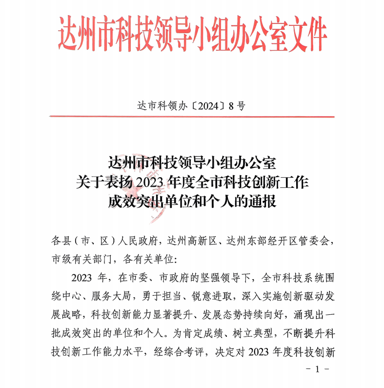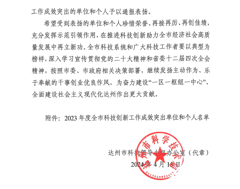 近日,达州市科技领导小组办公室下发《关于表扬2023年度全市科技创新工作成效突出单位和个人的通报》中,beat365官网李扬磊同志荣获“2023年度全市科技创新工作成效突出个人”称号。