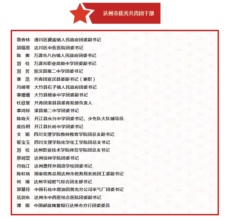 近日,共青团达州市委关于2024年达州市两红两优拟表扬对象的公示中,beat365官网崔宝玉同志荣获“达州市优秀共青团干部”称号。