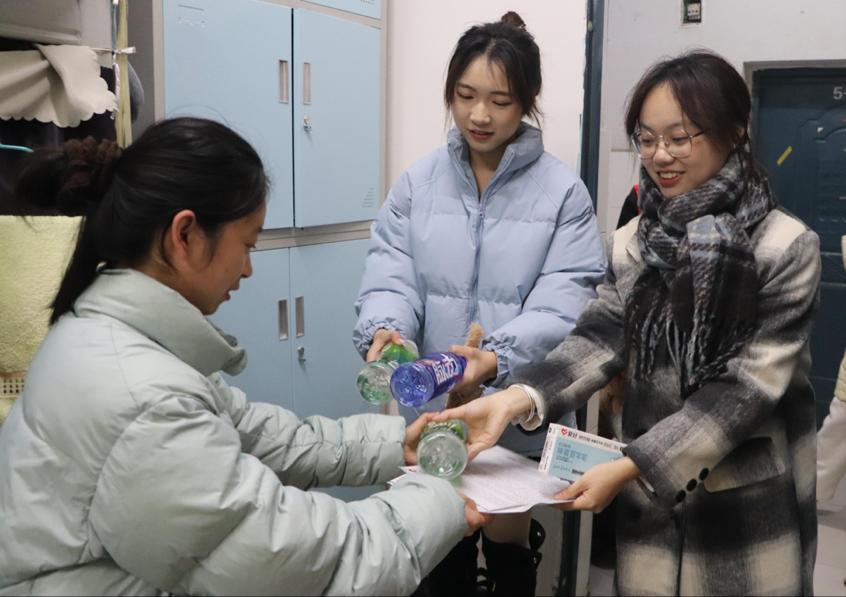 学院团学代表与志愿者团队带着慰问信、饮料和签字笔等慰问物资,满怀热忱地前往莲湖校区学生宿舍。他们逐一走访各寝室,将精心准备的慰问品送到毕业生手中。毕业生们接过礼品时,感激之情溢于言表,坚定表示会将母校的培育之恩铭记于心。随后,志愿者们亲手将一封封充满深情的慰问信交到学子手中,信中凝聚着他们大学校园生活的美好回忆,通过温馨的语句,深深表达了学院对他们在求职深造及创业道路上的不懈追求和辛勤付出的肯定,激励着他们以更加昂扬的斗志,勇敢地迎接未来的每一个挑战。