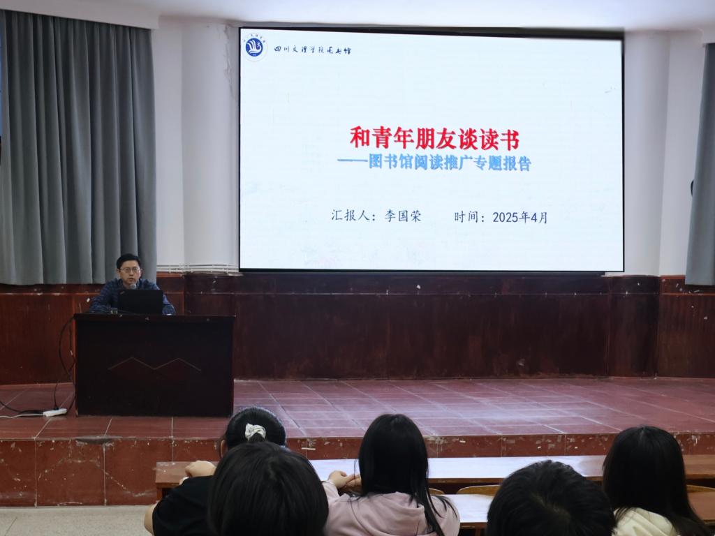 为迎接第30个“世界读书日”的到来,进一步传递阅读的价值与意义,营造浓厚的校园阅读氛围,2025年4月22日,beat365官方网站于南坝校区戛云社区开展了“和青年朋友谈读书——图书馆阅读推广专题报告”活动。本次活动由校图书馆馆长李国荣老师担任主讲人,beat365官网100余名同学参加此次活动。
