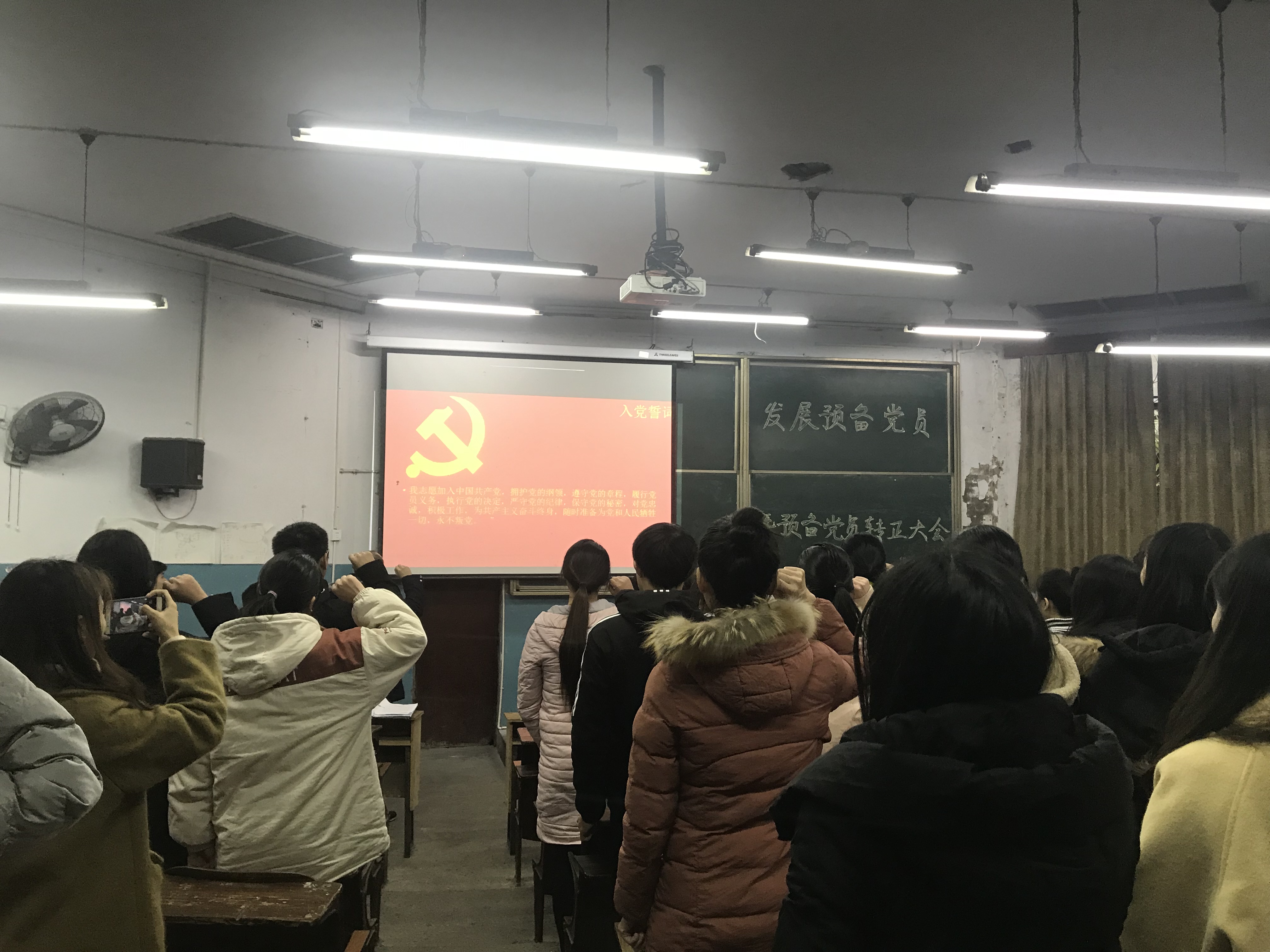 最后,全体人员重温了入党誓词。屈川副书记对本次大会进行了总结发言,对转正的党员同志和新发展的预备党员同志表示了衷心的祝贺并给予了殷切希望,屈川老师表示希望同志们能够严于律己,严格规范和约束自己,认识到入党的严肃性,在广大群众中充分体现党员的先进性,真正起到模范带头作用。相信新党员一定会成为党的新生力量,为党和人民做出自己应有的贡献。