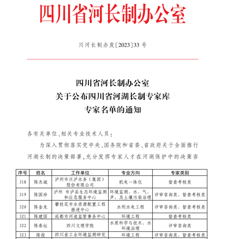 作为专家库成员陈春坛老师将发挥专业所长,积极响应习近平总书记发出的建设“造福人民的幸福河”伟大号召,全面落实习近平总书记来川视察重要知识精神,深入贯彻落实生态文明思想,为全省建设造福人民的幸福河湖贡献beat365官方网站力量。